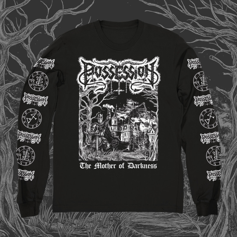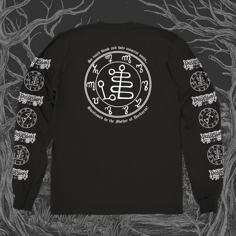 Black Gildan Ultra Cotton Longsleeve with white silkscreen print on front, back and sleeves