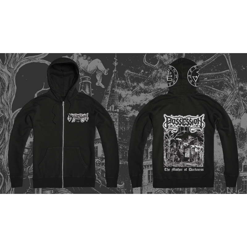 "AWDis Just Hoods" Black Hoodie Zipper with white silkscreen print on front, back and hood